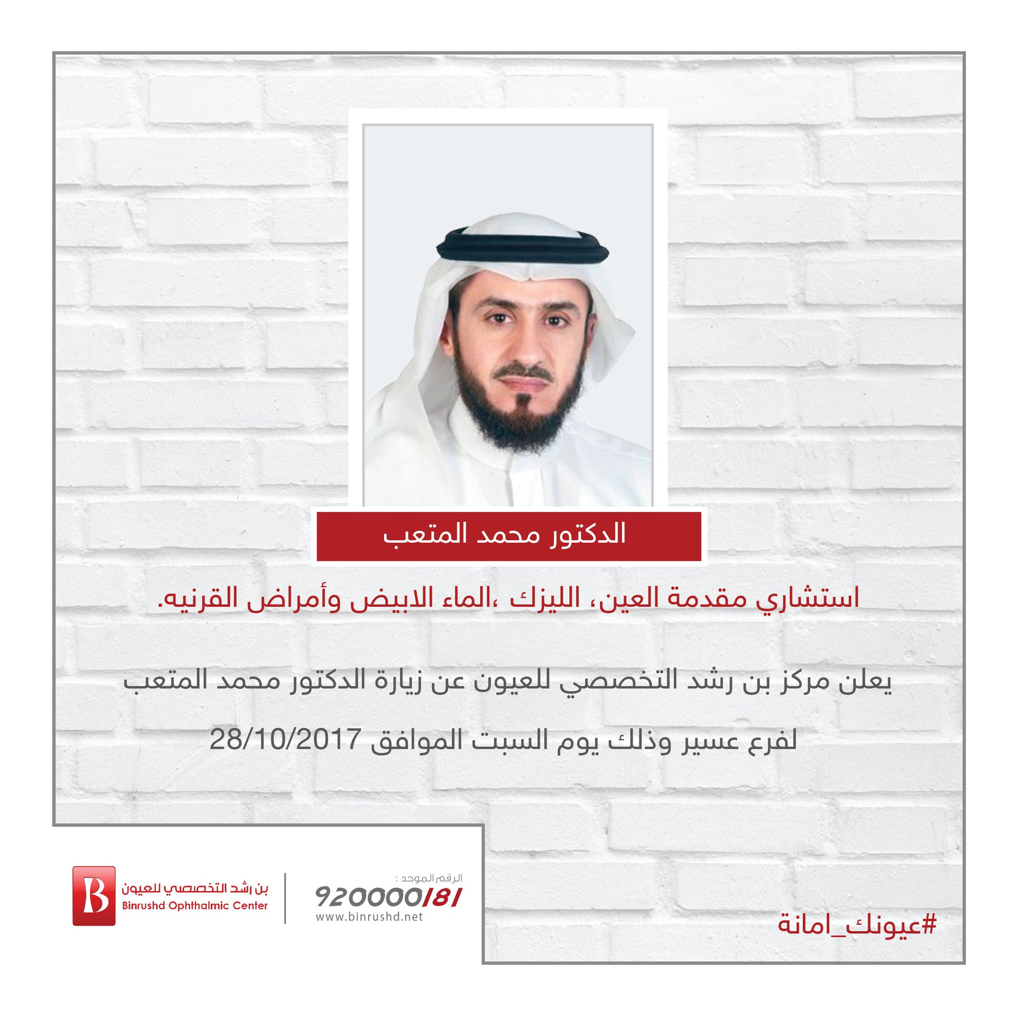 بــن رشــد الــتـخــصــصـي للعيون V Twitter اعلان يعلن مركز بن رشد التخصصي للعيون عن زيارة الدكتور محمد المتعب لفرع عسير و ذلك يوم السبت 28 10 2017 للتسجيل Https T Co 7bqnkqxrxv Https T Co Vfidx4hfxq